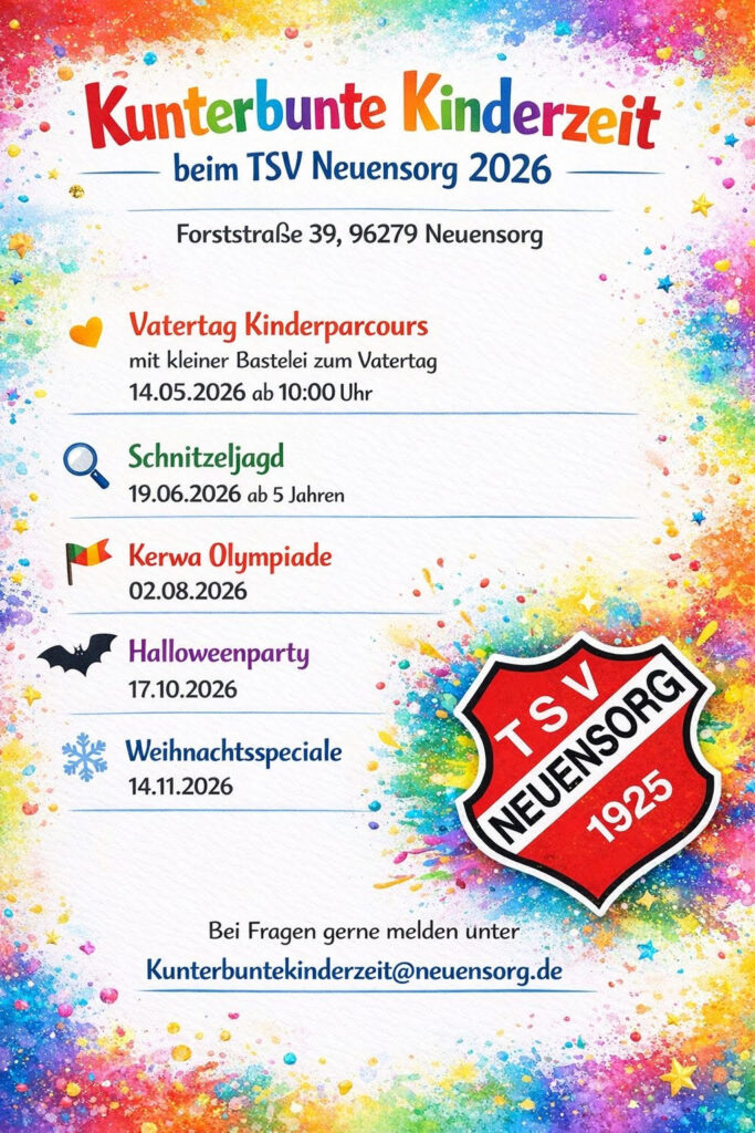 Auf dieser Seite teilen wir immer alle neuen Veranstaltungen der Kunterbunten Kinderzeit. Außerdem findest du hier alle wichtigen Infos, einen Ausblick auf kommende Aktionen und das Kontaktformular zur Anmeldung.